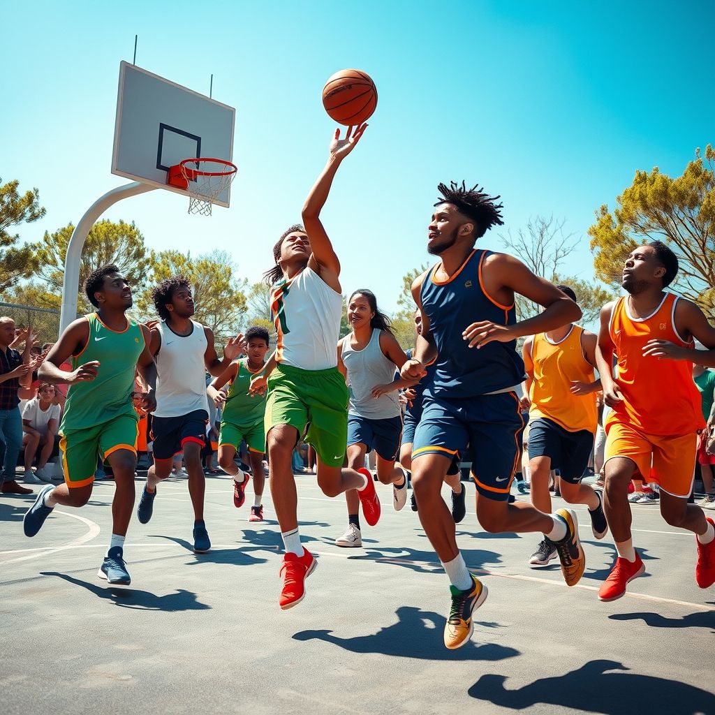 篮球运动会不仅是一场激烈的竞技赛事,更是一种展现团队精神和个人魅力的舞台。在这片球场上,每一名参赛者都将全力以赴,尽情展示自己的技术和耐力;而观众们,则在场边为自己支持的队伍加油助威,整个场面气氛热烈,充满了青春与力量的碰撞。